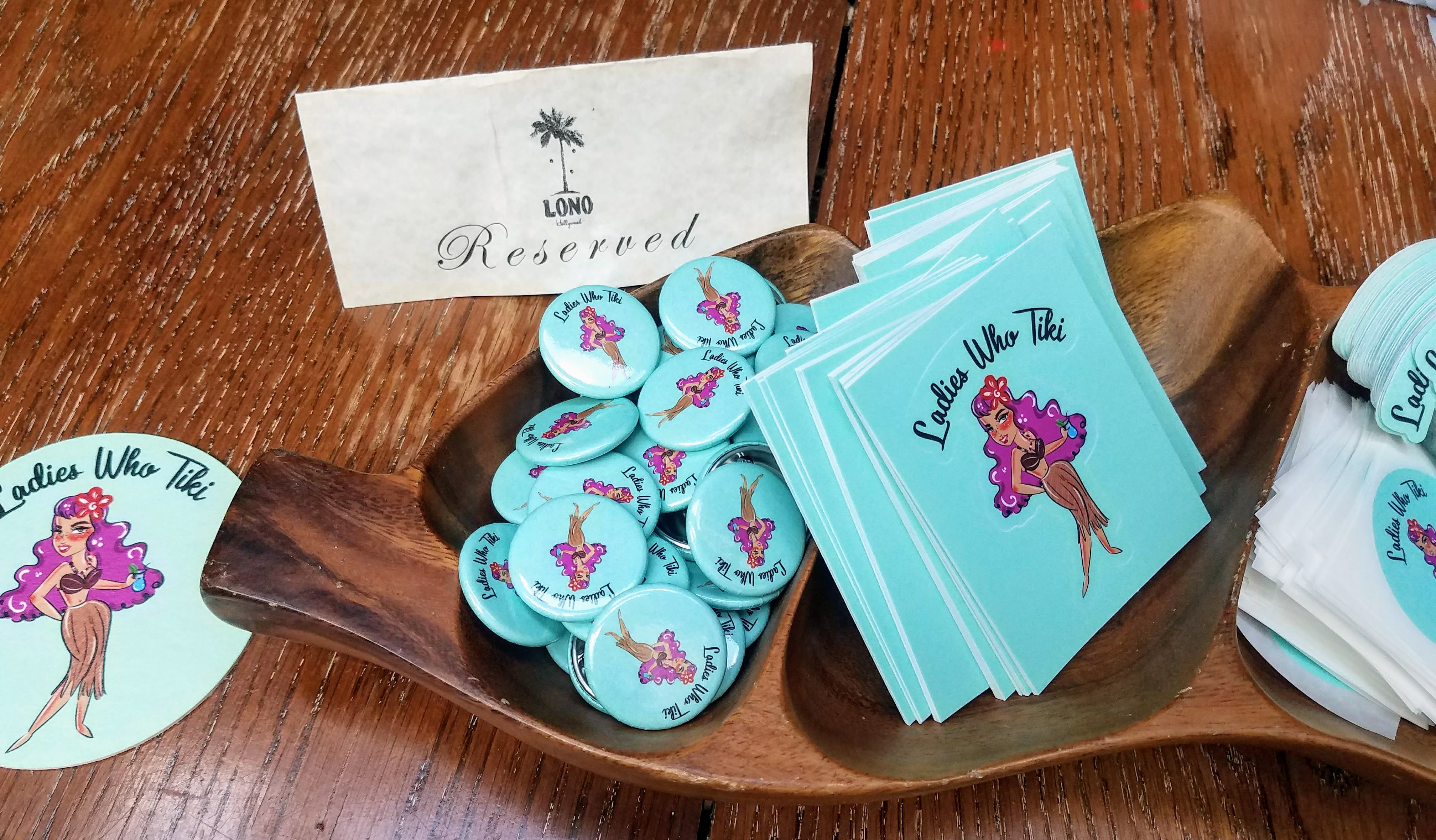 Tiki Ti was the home of the first official Los Angeles Ladies Who Tiki meetup event. Michelle Perez, founder of Ladies Who Tiki, carried in a large box of stickers and pins to giveaway to fans while she greeted everyone. The bar was packed with a line out the door on Tiki Ti’s otherwise quiet night. Everyone was dolled up in their favorite Polynesian garb and accouterments. New friends were made and an overall welcoming feeling was prevalent throughout the whole bar. Ruby Champagne, Miss Tiki Oasis 2018, was present and received the “okay” from Mike Buhen Sr. himself, to pose on the bar top for a photo op. (Apparently, this was unheard of! Guess the Ladies Who Tiki made a good impression.)