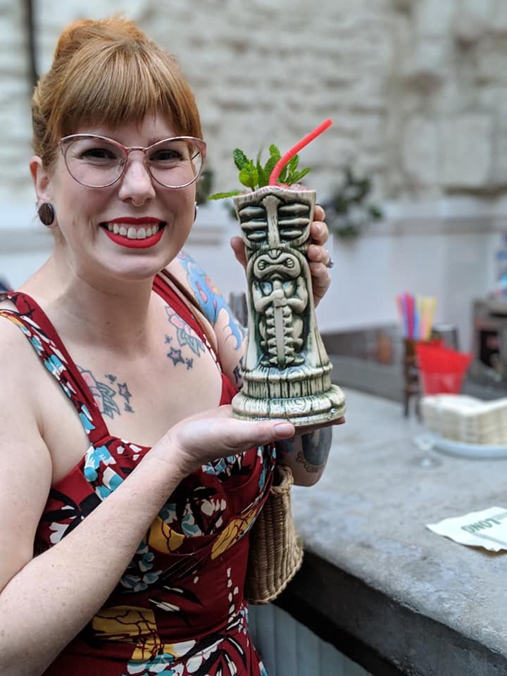 For the March WCW guest, Jeanie Grant from San Francisco’s Pagan Idol was behind the bar. She got her start in Tiki and rum culture in Seattle and now makes her home in the Bay as the Bar Manager for the popular Pagan Idol. She enjoys traveling to the source of spirit production (ie. St. Martinique, Jamaica, etc.), and creating the ultimate hospitality experience (as seen in her epic garnishes such as a Moai carved into a banana). Jeanie also holds the titles of reigning Iron Tikitender and Miss Speed Rack California.